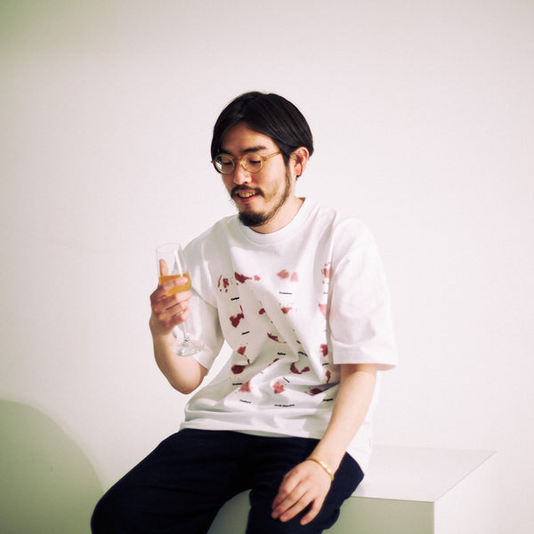 様々な場面でイレギュラーに出現してしまうワインの染みとブドウの品種名をプリントし、ボディにはスウェットとTシャツの中間的厚みのSomewhere in Tokyoオリジナルボディを採用。