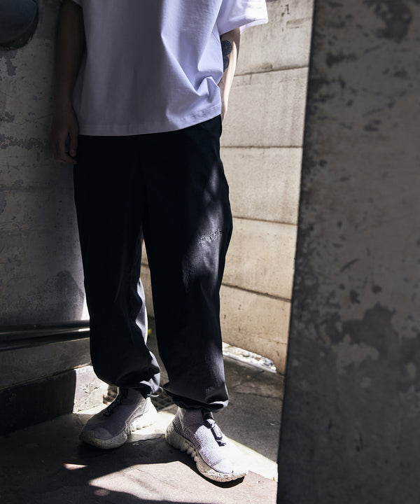 コットンのように光沢感が少ないナイロン生地を使用したトラックパンツです。バックポケットにはスマートフォン用のファスナー付きポケットとドットボタン付きのポケットが有り、裾にドローコードが付いているので裾を絞ってシルエットの変化を楽しむ事ができます。